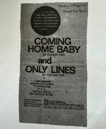 Introductory note by Yeow Kai Chai Stepping into the corner apartment on the highest floor of an HDB block, I recall the first time I was here, about two decades ago, when the poet-playwright-librettist-novelist, Robert Yeo, and his family first moved there. Two decades later, the flat remains bright, open and airy, but now its walls overflow with a thousand more books and other literary thingamajigs – not unlike Yeo himself. He remains, at the impressive age of 86, quite the raconteur, with an incredible roll of juicy anecdote — Wong May had choice words about his juvenilia, for one — at the tip of his tongue. It is clear the man has much to share. The reason I'm here is because the stalwart writer has unearthed, among piles of letters, newspaper cut-outs, flyers, what-not's, a few pages containing a hitherto-unseen interview with a compatriot, the iconic poet Arthur Yap, who died in 2006 from laryngeal cancer. Yeo had found it as he was preparing for a panel discussion at an upcoming symposium, Revisiting the Voice(s) of Arthur Yap: 20 Years On, to be held at the National Library in June 2026. Yeo and Yap first met each other at St. Andrew's School, the former three years older than the latter. Yeo had gone on to pursue his pre-university education there from 1957 to 1958 after topping his O-levels cohort at Serangoon English School. Yap was at St. Andrew's from 1950 to 1962 from primary to pre-university. They both attended the University of Singapore and pursued academic careers. In 1971, their paths crossed again as Federal Publications brought out their first poetry collections at the same time: Coming Home Baby by Yeo and Only Lines by Yap. Yeo recalls the launch was held at the old MPH at Stamford Road and drily notes that very few people turned up. He shares the original covers, as well as an advertisement in the 11th April 1971 issue of The Straits Times. The copy hailed them as being "more than only lines, aloof and subtle, sophisticated, sarcastic—yet every now and then the poets give glimpses of undisguised emotions." ![]() ![]() Yeo doesn't remember when and why exactly the interview took place, except that probably happened in the 1990s, and that it must be over print, meaning that he had typed out the questions on several pages of paper, and handed them to Yap. Yap then mulled over the questions and typed out his answers. Yeo reveals that he was at that time trying to unravel how Yap's linguistic background – the latter having attained a Master of Arts in Linguistics and English Language Teaching from the University of Leeds – informed the poetry too. He then shows me a rare copy of Thematic Structure in Poetic Discourse (Copinter, 1987) which he reckons was adapted from Yap's PhD thesis at National University of Singapore. In 1999, Yeo parsed Yap's verse in terms of structural approaches such as textual cohesion, taxis, foregrounding and collocation for an essay "Parts of Speech: A Speculative Note on Arthur Yap's commonplace" which was published in Interlogue: Studies in Singapore Literature, Volume 2: Poetry (Ethos Books). Edited for brevity and house-style, here is the hitherto-unseen interview between Yeo and Yap. Interview Robert Yeo: What made you decide to write? When did you commence to write? Arthur Yap: In school, it was for no other reason than to get something in the school magazine. Another reason was boredom. I started writing when I started secondary school. The subjects I liked took very little of my time and the subjects I disliked took not a bit of my time at all. Hence, I started to paint and write. But it was not until I graduated from the university that I took a more serious interest. I threw away all my juvenilia as a start and am still having to throw away things. RY: Do you see anything paradoxical in using English? AY: When in school, I was fairly proficient in both Mandarin and English. But as the medium of instruction was English, proficiency in Mandarin declined to a sogginess. Also, when I started reading whatever I could get hold of, the books were largely in English. After a while, whatever I read was and is in English. RY: Why did you choose poetry in preference to, say, prose? AY: I have done a little prose writing, but find poetry to be more absorbing. It demands a kind of economy and precision that may not be essential in prose. RY: Were your style and outlook influenced by other writers? AY: I would say no. There are many writers I admire. Before completing secondary school, I had read everything by D. H. Lawrence. I can't say he had any influence on me. I was intrigued by his prose, but found many of his poems clumsy. More currently, I read a lot of Japanese literature in translation. I have read all of Philip Larkin, V. S. Naipaul and a few others. Had I been younger, I would have been moved to do imitations as a form of flattering myself. RY: What poets have influenced you? Have you been influenced by writings other than poetry, such as history, sociology and other subjects? If so, how? AY: I admire Larkin's control. James Dickey considers him a lightweight poet. I don't think Larkin set out to be a sumo wrestler of poetry. Edward Thomas I also admire for his clear use of language. Of Singapore writers, the only person I do look up to is Edwin Thumboo, for two reasons, one of which is not due to poetry. We need a focal point, he supplies it. The other is that many writers have been influenced by him, consciously or otherwise. I don't think any kind of influence is necessarily good or bad per se. When one has found one's own poetic feet or sandals, the influence passes. While it was there, it was formative. I read a lot of other stuff. I enjoy reading what writers, painters, musicians and other people say about their own work. Also, essays, articles on the cinema, autobiographies. RY: Have the work of other writers in Malaysia/Singapore been helpful? AY: Thumboo's Gods Can Die; a very few poems by Wong May. RY: What are 